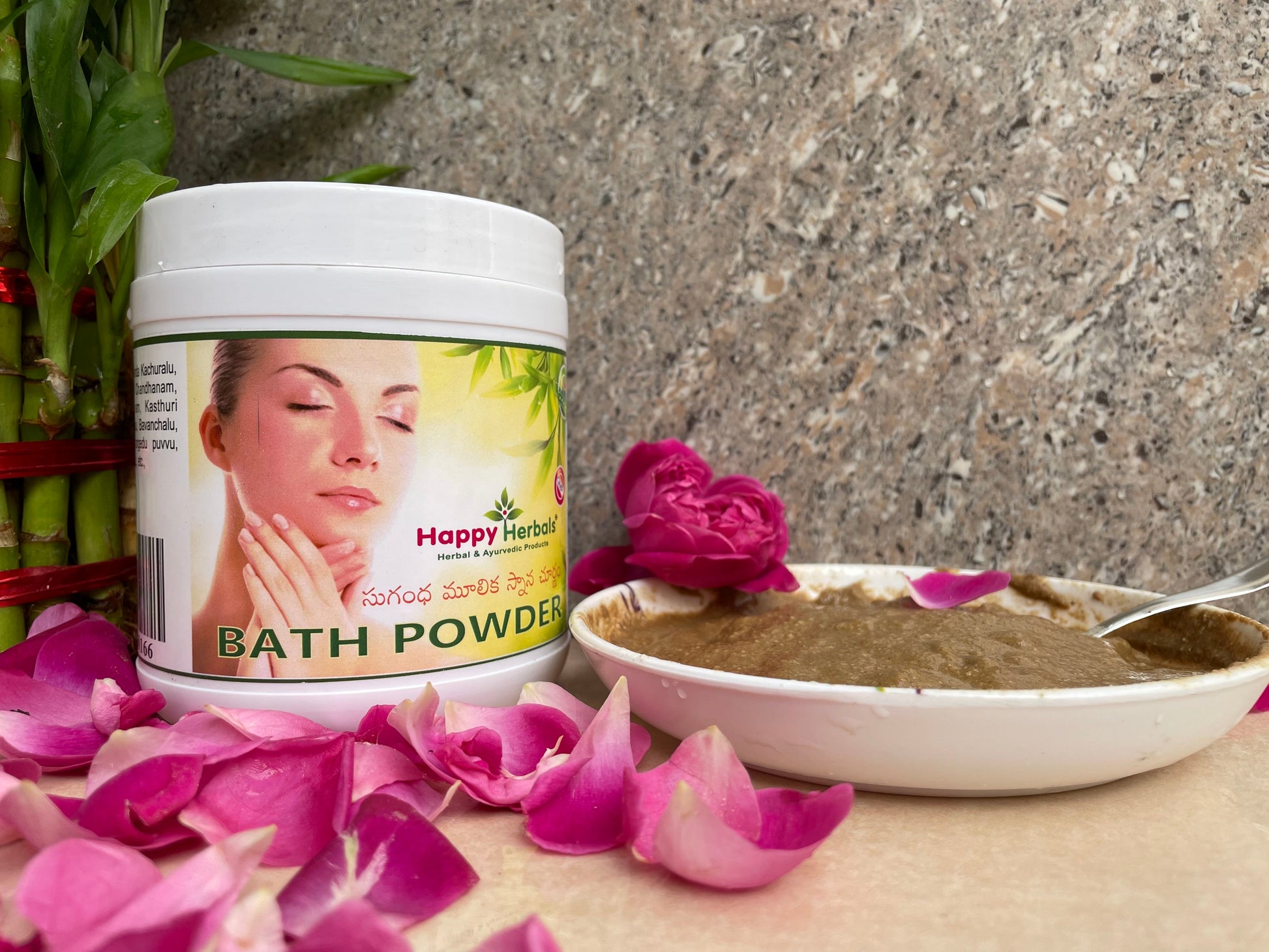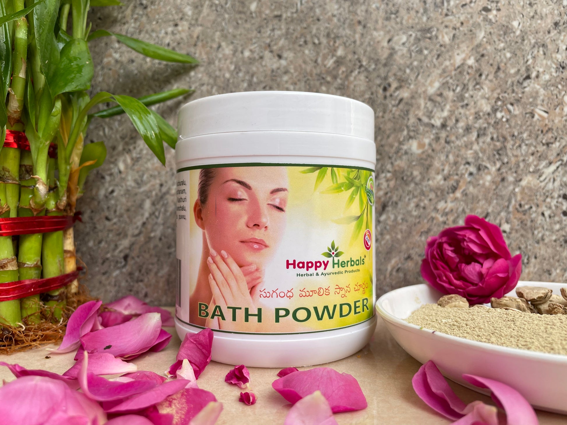 Body odor is primarily caused by the proliferation of bacteria on the skin, which metabolize sweat and produce foul-smelling compounds. Bath powder works to combat body odor through multiple mechanisms. Firstly, its cleansing action removes sweat, dirt, and excess oils that can harbor odor-causing bacteria. Additionally, certain herbal ingredients like Vatti Verlu and Ulavalu possess antimicrobial properties that inhibit bacterial growth. By keeping the skin clean and fresh, bath powder helps mitigate body odor, promoting a pleasant and hygienic scent throughout the day.