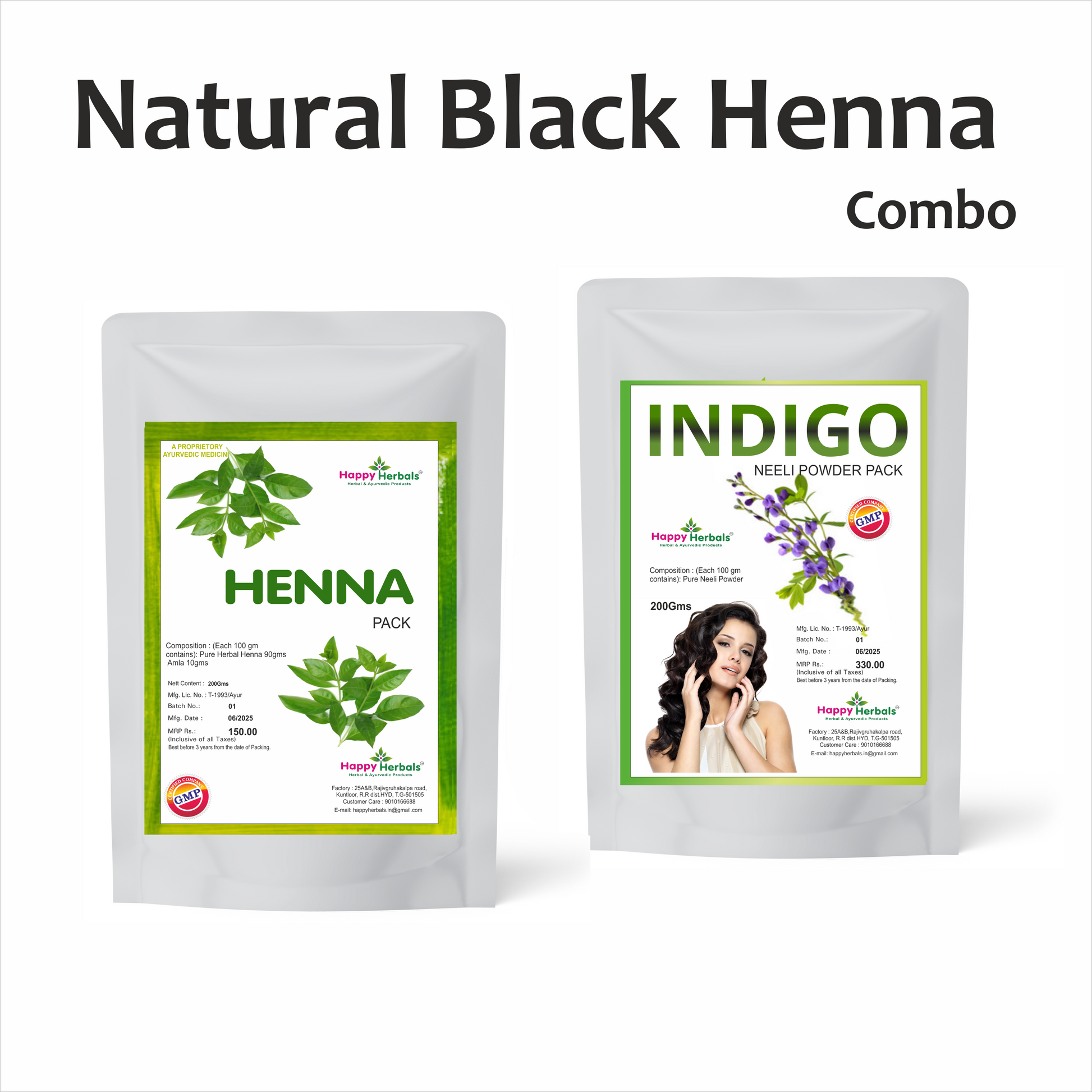 The Natural Black Henna Combo by Happy Herbals is a 100% herbal blend of Henna Powder and Indigo Powder, carefully combined to give your hair a rich black color naturally—without chemicals. This combo not only colors but also strengthens and conditions your hair deeply, making it ideal for regular use.